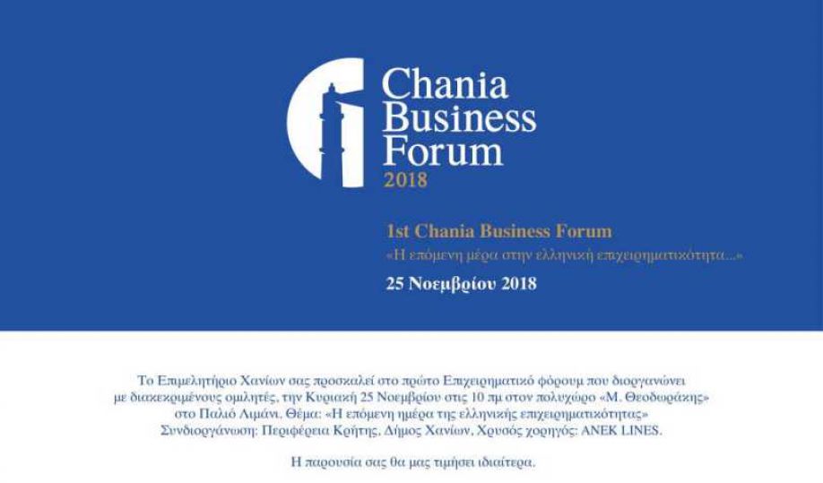 «Η επόμενη ημέρα της επιχειρηματικότητας («Chania business Forum 2018”) το θέμα του πρώτου επιχειρηματικού φόρουμ που διοργανώνει το Επιμελητήριο Χανίων την Κυριακή 25 Νοεμβρίου στις 10 το πρωί στον πολυχώρο «Μίκης Θεοδωράκης» στο Παλιό Λιμάνι.