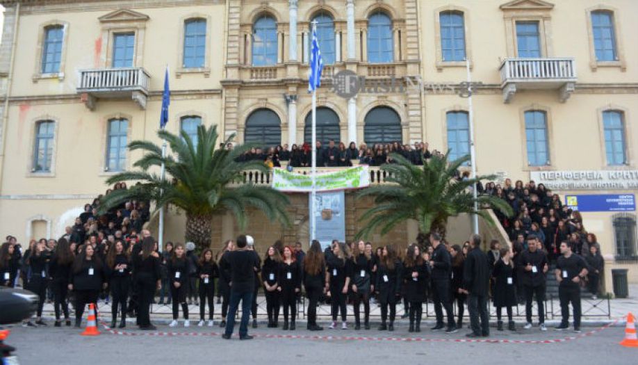 Και ενώ οι διερχόμενοι οδηγοί κοιτούσαν έκπληκτοι, το τραγούδι επαναλήφθηκε από τα σκαλιά του κτιρίου της Αντιπεριφέρειας Χανίων.