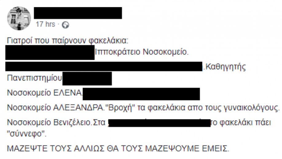 Με δημοσίευσή του στο Facebook, ηγετικό μέλος του «Ρουβίκωνα» κοινοποίησε ονόματα ιατρών που παίρνουν, όπως υποστηρίζει, «φακελάκια».