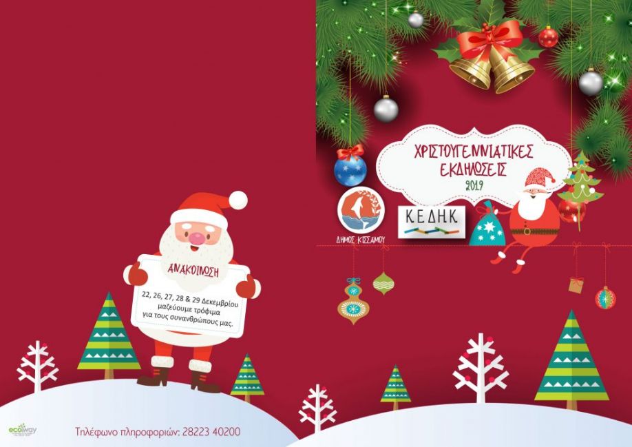 Ο Δήμος Κισάμου και η Κοινωφελής Επιχείρηση του Δήμου Κισάμου σας προσκαλούν στις Χριστουγεννιάτικες εκδηλώσεις που θα ξεκινήσουν την Κυριακή 8 Δεκεμβρίου με τη φωταγώγηση του χριστουγεννιάτικου δέντρου και θα ολοκληρωθούν την Κυριακή 29 Δεκεμβρίου.